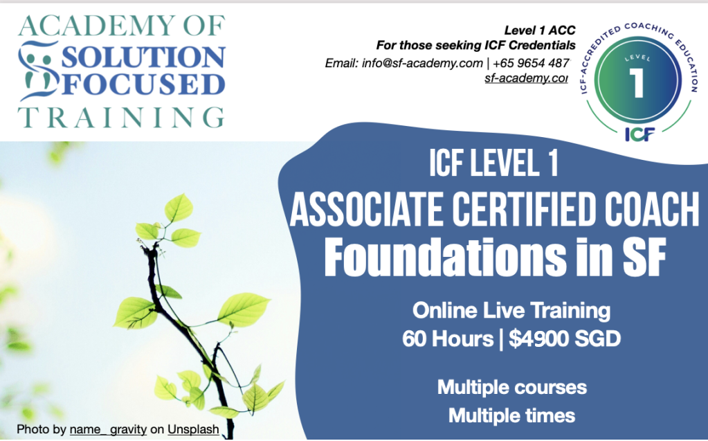Level 1 Training provides a solid foundation in the history, philosophy and mindset of Solution Focused Coaching, with a coherent coaching framework, and an elegant set of coaching tools and questioning techniques. The ICF Core Coaching Competencies and ICF Code of Ethics are reviewed and observed. With a focus on coaching skills development, the training program includes discussions, reflections, practice, demonstrations, Mentor Coaching and Observed Coaching.